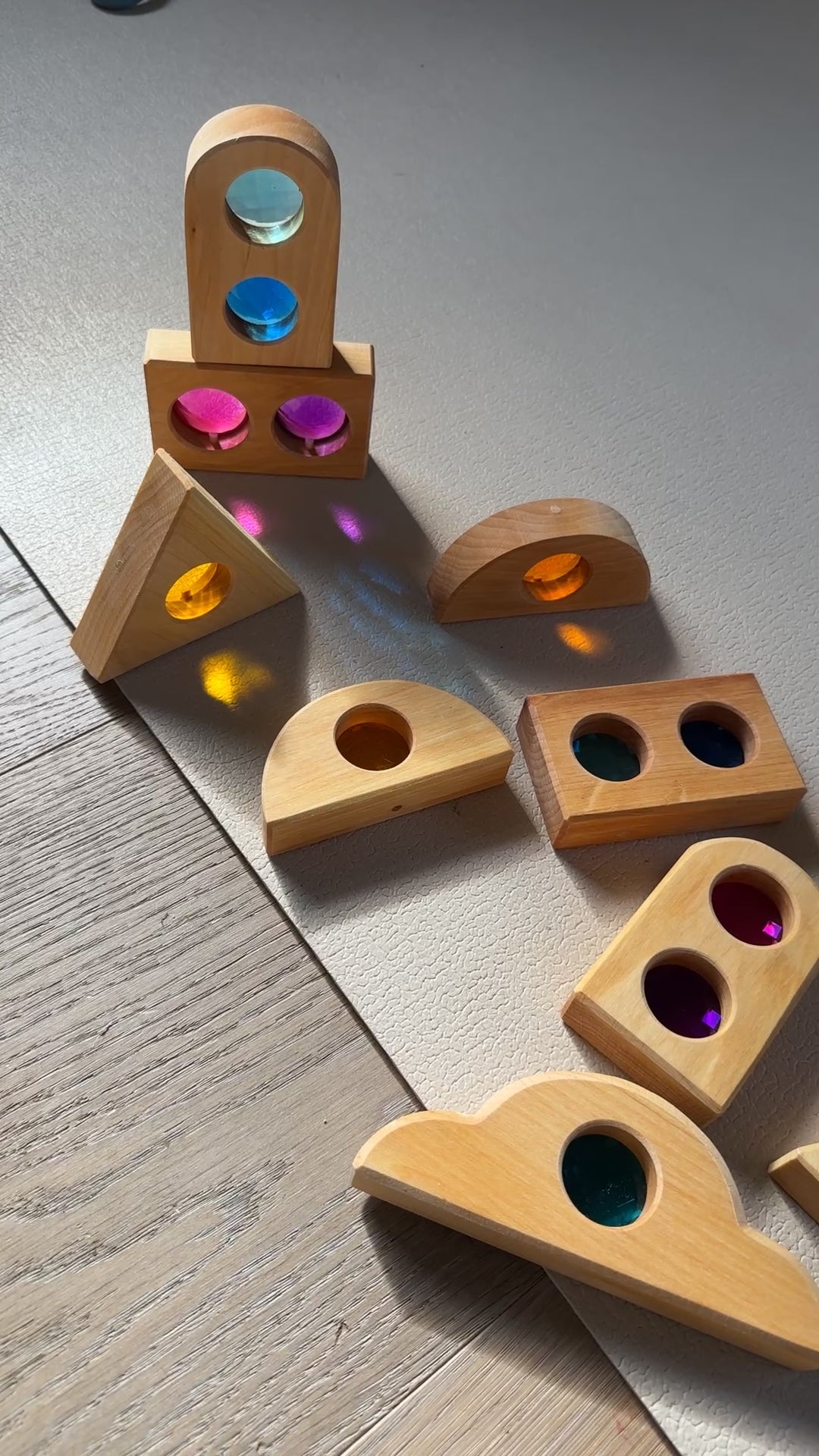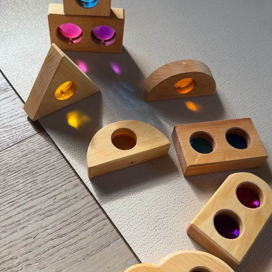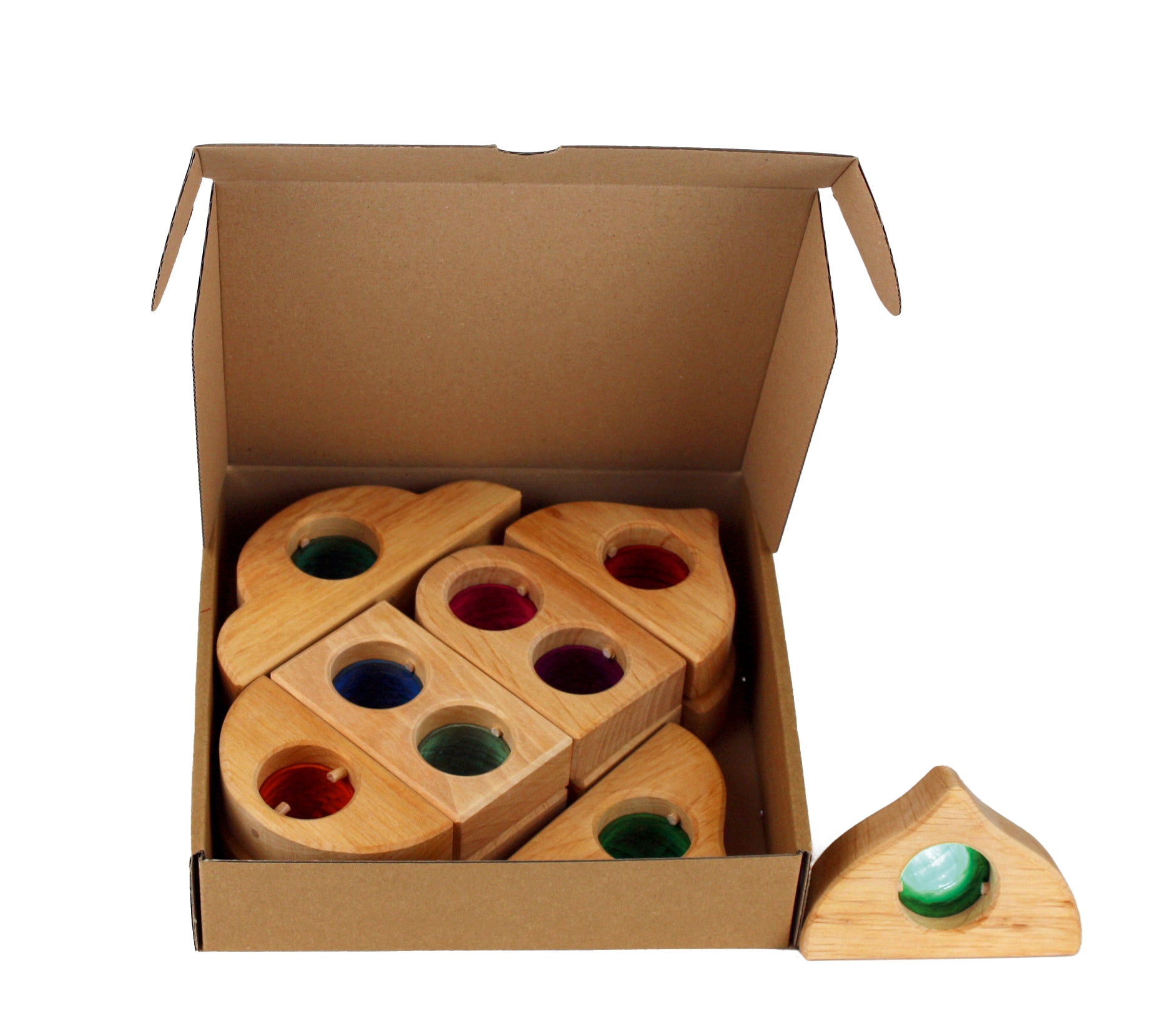 Das Set besteht aus massiven Holzrahmen, die sorgfältig mit einem bunten Acrylglas in verschiedenen Formen gefüllt sind. Das Acrylglas bricht Licht und Farben auf faszinierende Weise, was besonders beim Spielen an der Sonne oder mit einer Lichtquelle für spannende Effekte sorgt. Die stabile und langlebige Konstruktion macht das Spielzeug auch für intensives Spielen geeignet.