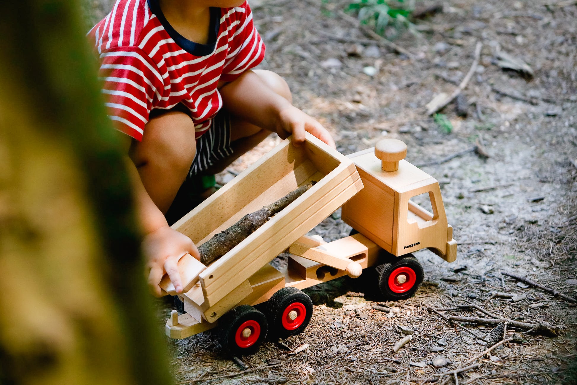 Besonders beeindruckend ist die durchdachte Verarbeitung: Der Muldenkipper wird ohne Nägel oder Schrauben hergestellt, sondern sorgfältig verleimt. Die bewegliche Kippmulde sorgt dafür, dass der LKW realistisch beladen und entladen werden kann, was die Fantasie anregt und gleichzeitig motorische Fähigkeiten fördert.