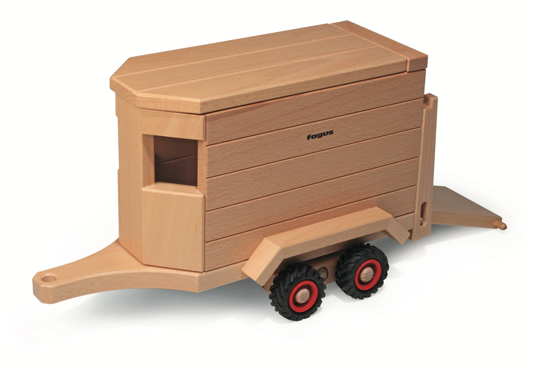 Der Pferdeanhänger ist aus hochwertigem, nachhaltigem Holz gefertigt und überzeugt mit seiner robusten Bauweise. Seine glatten, perfekt gearbeiteten Oberflächen machen ihn besonders sicher für kleine Kinderhände. Der Anhänger ist so konstruiert, dass er an die gängigen Holzfahrzeuge von Fagus angehängt werden kann – ideal für fantasievolle Spielszenen.