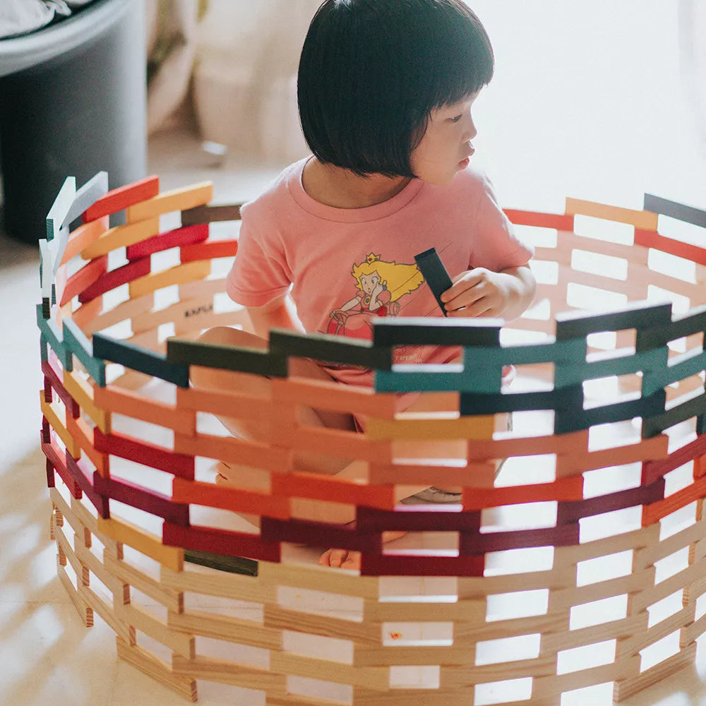 Der Kasten enthält Bausteine in acht harmonisch abgestimmten Farben. Diese verleihen den Kreationen nicht nur Stabilität, sondern setzen farbliche Akzente, die der Fantasie keine Grenzen setzen. Die Bausteine bestehen aus umweltfreundlichem Pinienholz und werden sorgfältig hergestellt, um höchsten Qualitätsstandards gerecht zu werden.